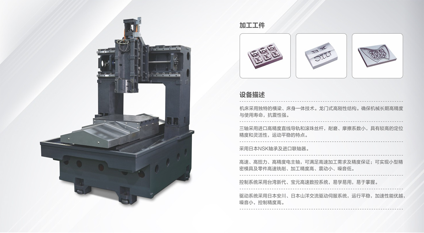 新型環(huán)保數(shù)控CNC -高速雕銑機采用高速24000-48000轉電主軸,選配靜電式油霧凈化器,三軸采用線性導軌,速度快,精度高,是模具、電極、批量零件加工;采用臺灣新代或臺灣寶元控制系統(tǒng),日本YASKWA電機及驅動,臺灣上銀、銀泰導軌及滾珠絲桿,華雕精密主軸,是高轉速、高移動速度的結合。